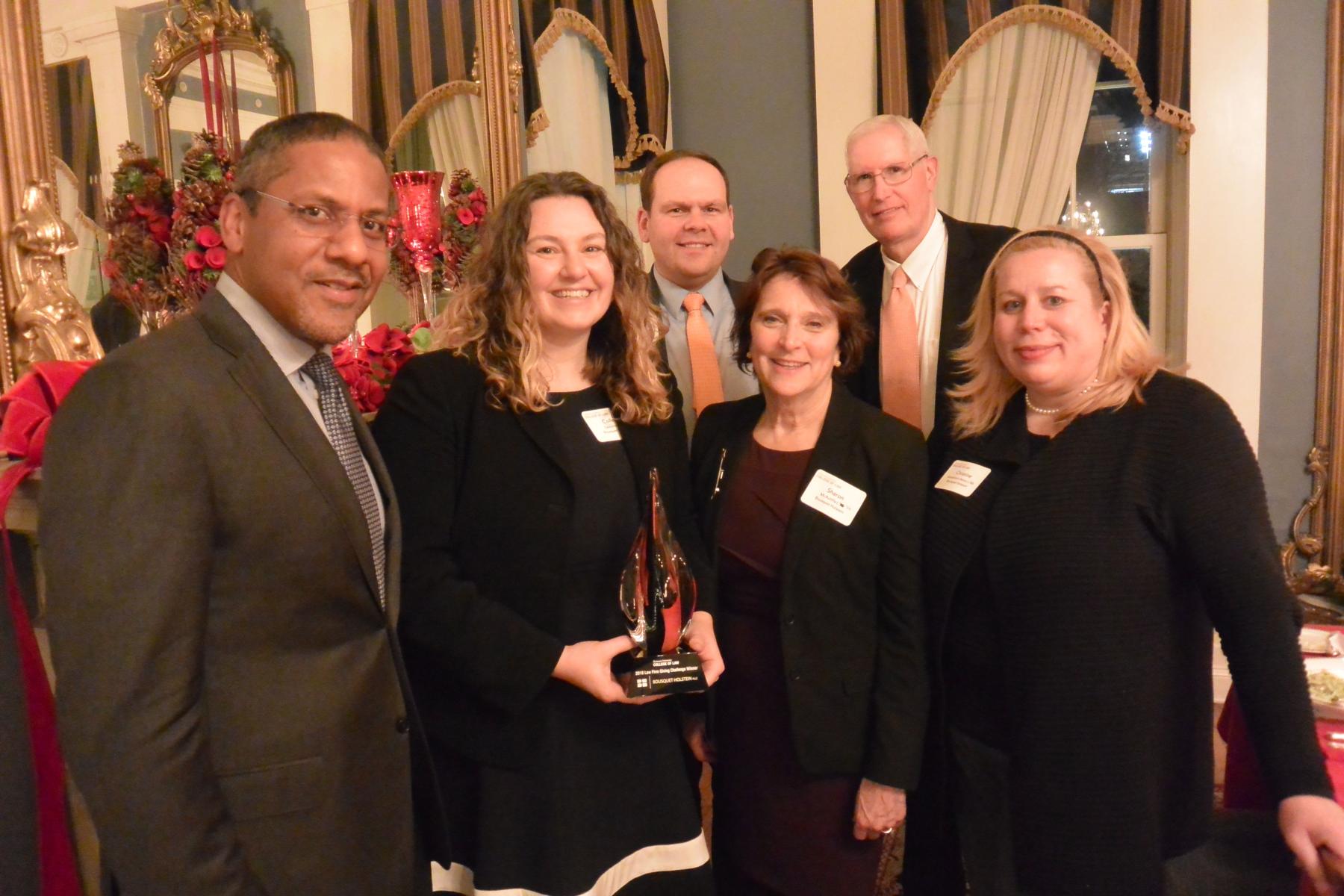 this week for winning the Syracuse University College of Law’s first-ever Law Firm Giving Challenge in the medium-sized law firm category (16-50 attorneys). In April 2017 the Law Firm Giving Challenge was created to help establish a tradition of philanthropy among alumni and to leave a legacy for future students the College of Law. The College challenged alumni at Syracuse-area law firms to mobilize support for their alma mater by holding a friendly giving competition. All gifts were made during the 2018 fiscal year (July 1, 2017 – June 30, 2018). Colleen Gibbons served as the Challenge Leader at our firm. Pictured are SU College of Law Dean Craig M. Boise, and SU College of Law alumni Colleen Gibbons, Michael Tyszko, Sharon McAuliffe, Gary Lavine, and Christine Woodcock Dettor.