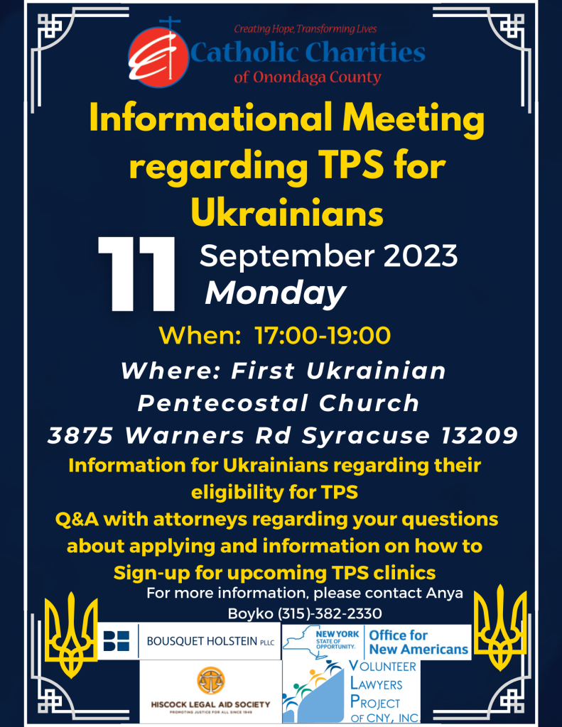 On Monday, September 11, Bousquet Holstein immigration attorney Anna Putintseva presented on Temporary Protected Status (TPS) eligibility at the First Ukrainian Pentecostal Church in Syracuse, New York. Anna discussed the process of applying for and renewing TPS in the United States, as well as topics related to work and travel authorizations.